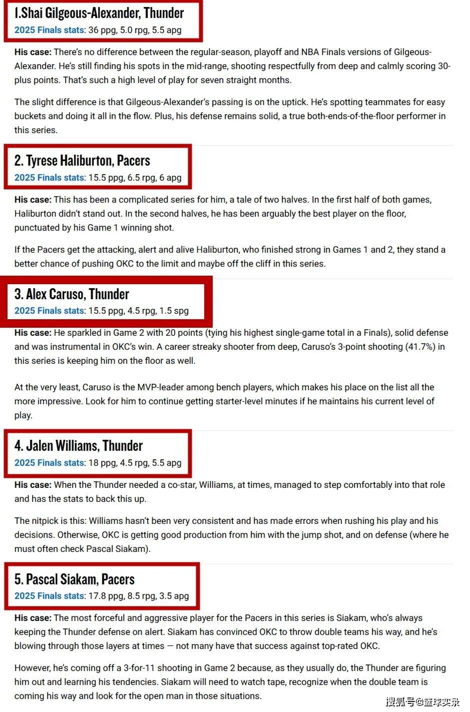 在G3开始前,NBA官方公布了最新的FMVP排行榜,前二并没有悬念——亚历山大两场合砍72分,稳居第一毫无疑问,紧随其后的是哈利伯顿,后者曾在G1上演0.3秒中投绝杀。