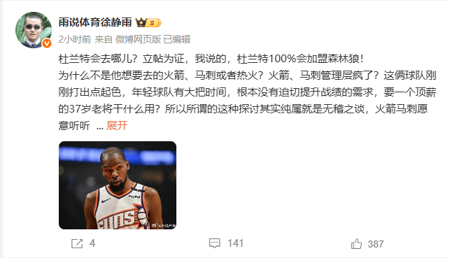 NBA休赛期还没到来,交易市场已经热闹起来。关于杜兰特下家的交易传言,跟雪花似的到处都是。球迷们都眼巴巴地盼着,好奇这位超级球星到底会去哪队?你瞧,我们熟悉的体育媒体人徐静雨也忍不住,在网上说了自己的想法。