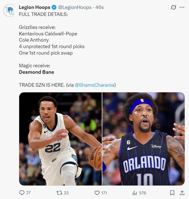 北京时间6月15日晚,ESPN名记Shams报道,灰熊与魔术达成交易,灰熊将德斯蒙德-贝恩送到奥兰多换取波普、科尔-安东尼、四个首轮签、1个首轮互换权。