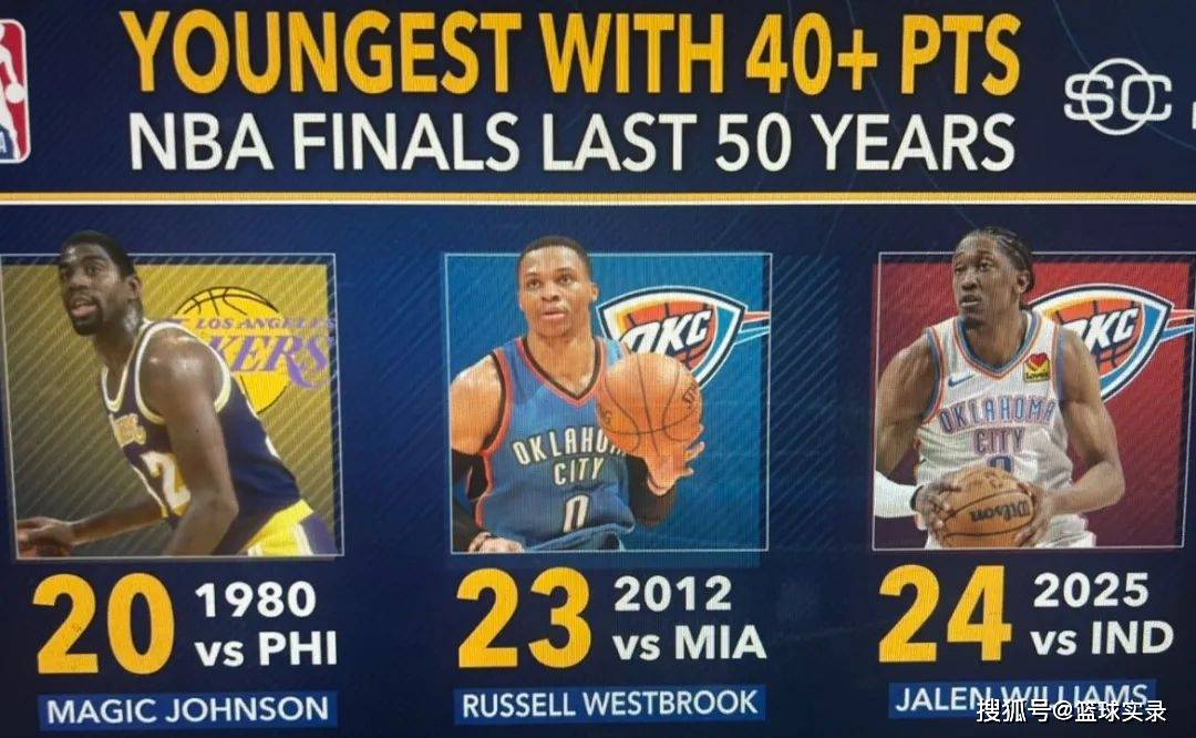 ——24岁63天的杰威成为1976年至今NBA第三年轻的总决赛40分先生,比他更年轻的只有魔术师(1980年,42分,20岁276天)和威少(2012年,43分,23岁220天)