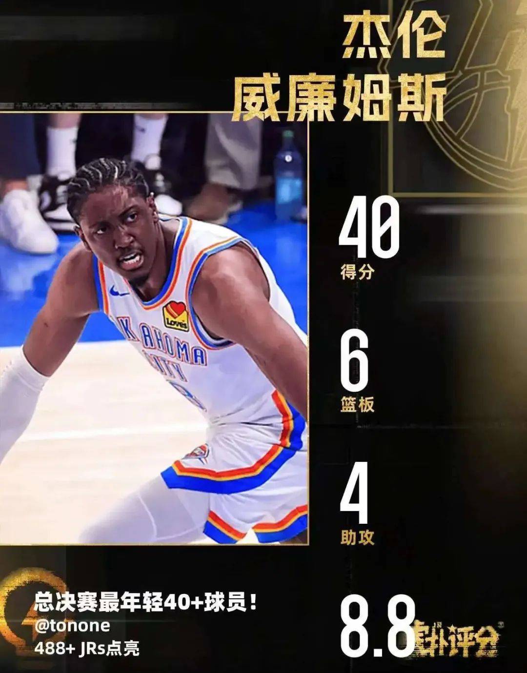 要说这场比赛雷霆的关键先生必须是杰伦-威廉姆斯,全场出战35分钟,25投14中,其中三分球5中3,罚球12中9,得到40分6篮板4助攻1抢断!