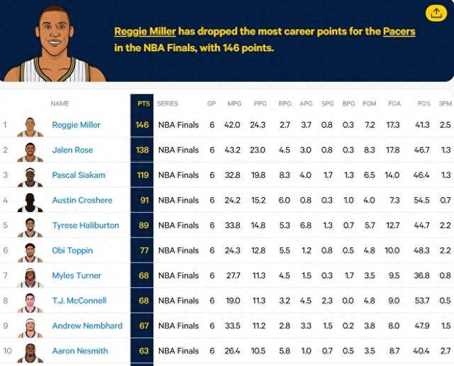 西亚卡姆本赛季总决赛累计得119分,步行者队史第三人