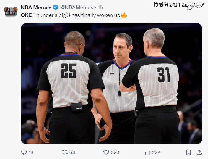 美媒NBA Memes晒出三位裁判的图后写道:雷霆三巨头是时候发力了。