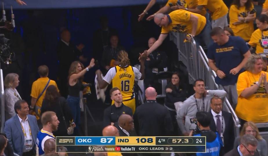 总决赛双方,如果你要说谁的实力最强,有人会觉得是西亚卡姆,有人会觉得是亚历山大,或者是杰伦威廉姆斯,更或者是哈利伯顿,反正没有明确答案。但如果你说谁的武力最强,我估计大家都只有一个答案:詹姆斯约翰逊。