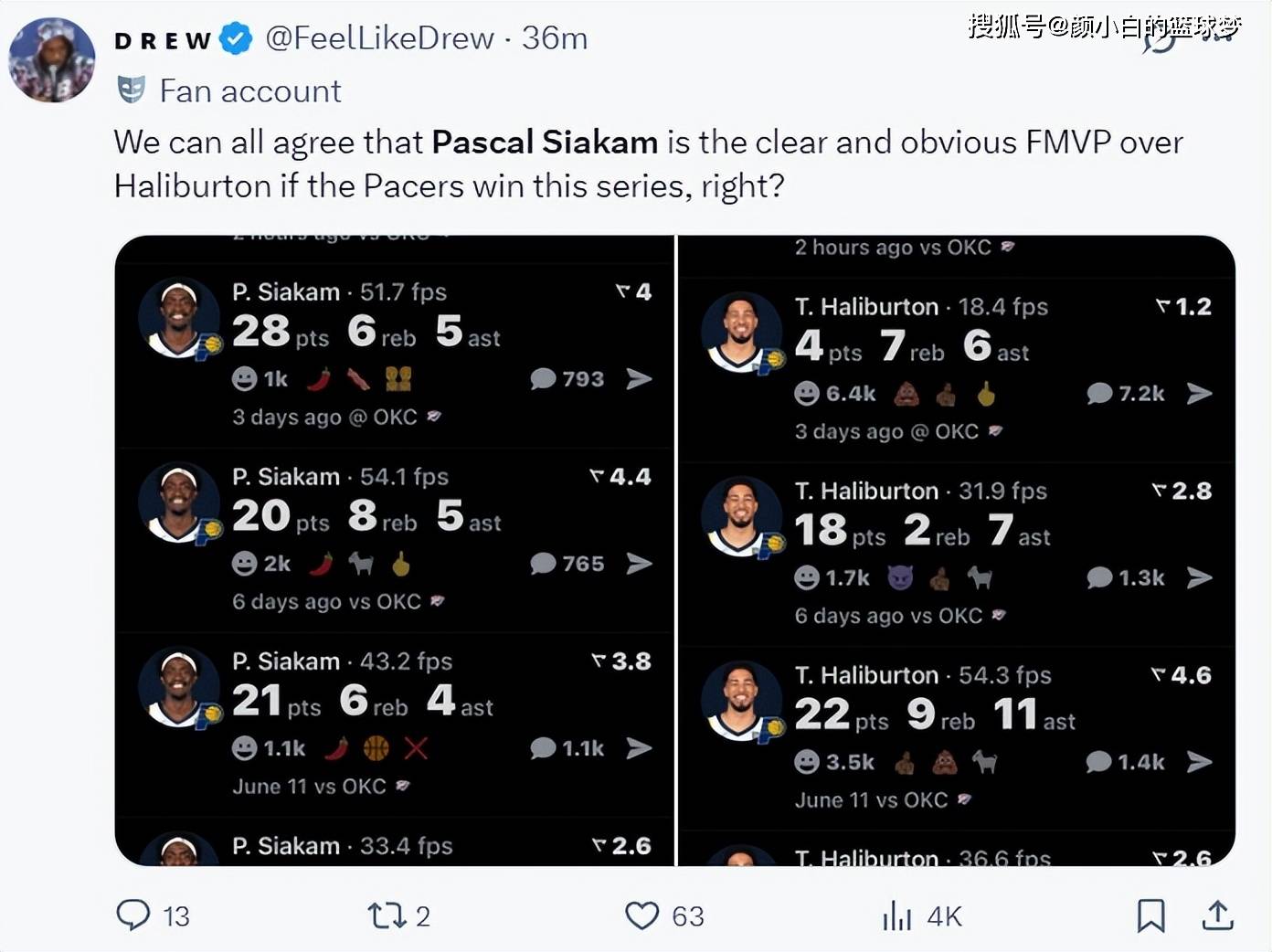 美媒晒出西卡与哈利伯顿总决赛的数据后写道:如果步行者夺冠那么西卡就是毫无疑问的FMVP对吧?西卡总决赛场均19.8分,哈利伯顿总决赛场均14.8分。