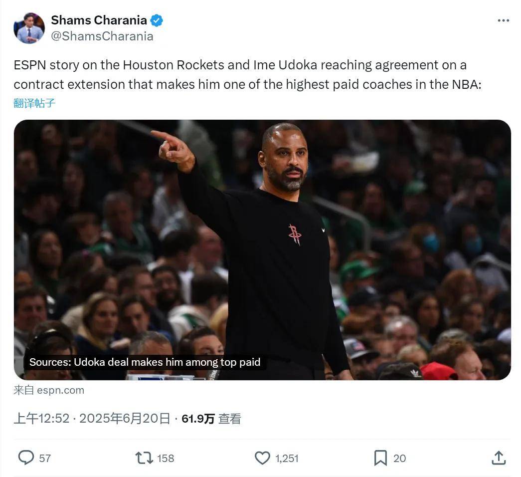 北京时间6月20日,据NBA名记Shams报道,火箭队和主教练乌度卡签下一份多年续约合同。年薪达到八位数(千万美元),乌度卡成为NBA收入最高的主教练之一!乌度卡原有的合同2027年夏天到期,这次续约的年限并未公布。