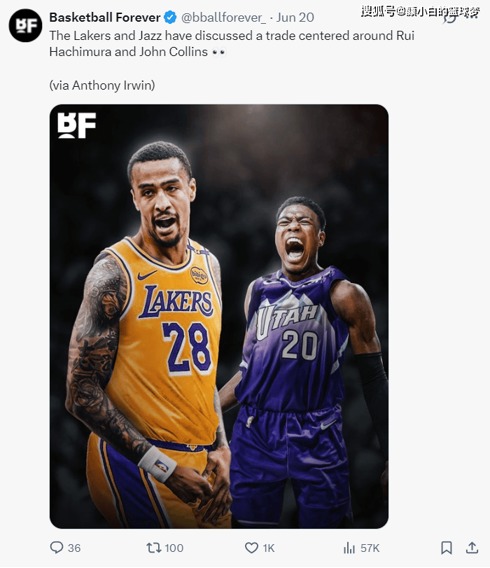 一天之前,湖人记者安东尼-劳瑞恩透露,湖人队已经与爵士队讨论过关于八村垒换约翰-科林斯的交易,这笔交易如果达成,湖人的四号位有了尺寸的升级,科林斯是一位裸足2.08米足尺寸的PF,而八村垒是2.03米的四号位。