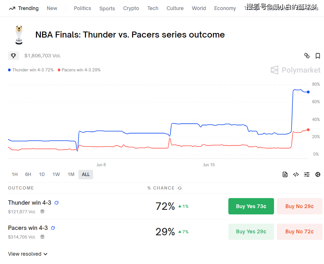数据预测媒体Polymarket预测步行者4-3夺冠的概率只有29%。