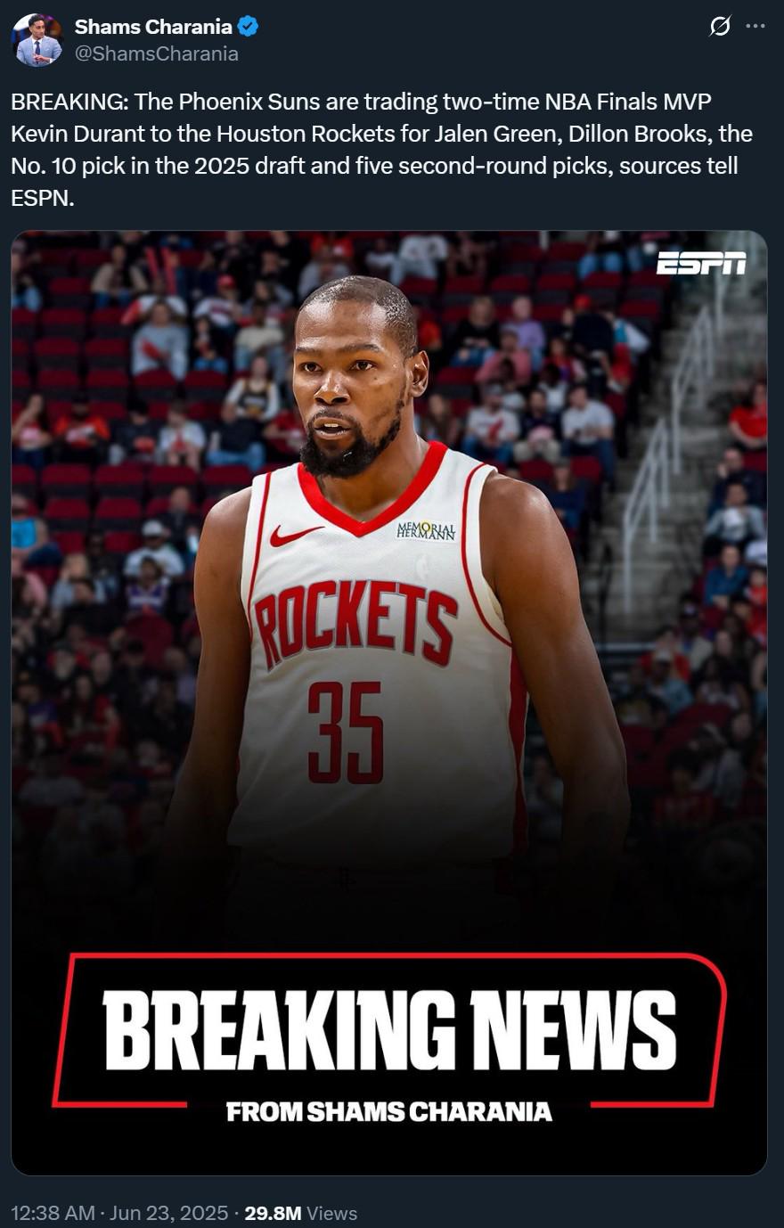 北京时间今日,据NBA名记Shams报道,太阳队将杜兰特交易至火箭队,换回了杰伦-格林、狄龙-布鲁克斯、今年的10号签以及5个次轮签。