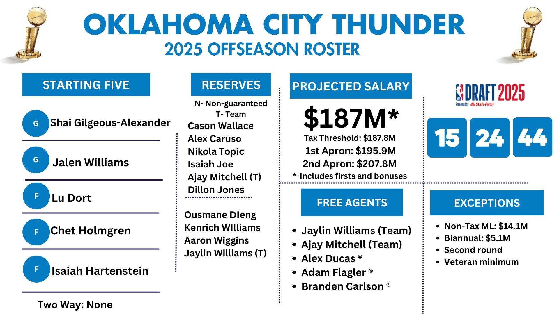 雷霆队作为一支年轻球队,他们的建队核心阵容主要来自于选秀,切特-霍姆格伦、杰伦-威廉姆斯和卡森-华莱士等人都是雷霆管理层通过选秀引援的杰作。据统计,从今年选秀大会直到2030年,雷霆队仍将拥有11个首轮签,可谓是既赢在当下也拥有着未来。此外,正因为拥有着许多拿着新秀合同的球员,雷霆队也成为了历史上第六支不缴纳奢侈税夺冠的球队。