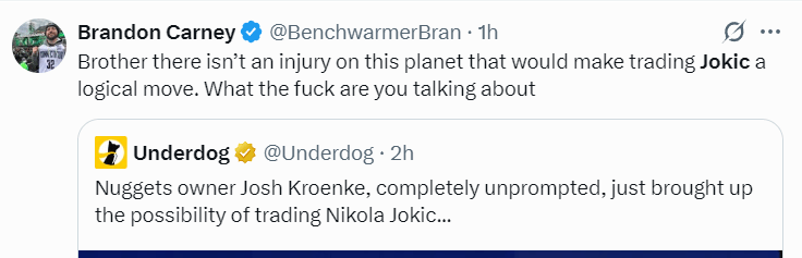 掘金记者:兄弟,这个星球上没有任何一种伤病会让人觉得交易约基奇是明智之举,克伦克你到底在说什么?这根本说不通啊。