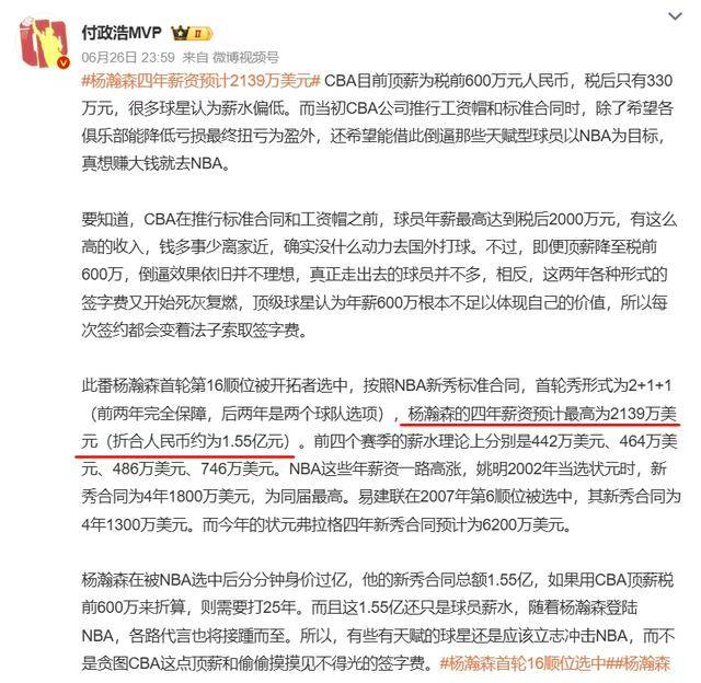 随着选秀落定,杨瀚森的新秀薪资细节迅速引发轰动,根据NBA薪资网站Spotrac披露,他的合同总额达4年2139万美元,折合成人民币约1.55亿人民币!具体构成逐年跃升:2025-26赛季442万,次年464万,第三年486万,到2028-29赛季将飙升至746万美元,这笔财富在中国篮球史上前所未有,直接超越姚明首年386万美元的薪资纪录,更碾压周琦4年557万、王治郅3年600万的合同,若对比CBA顶薪(税前600万),这笔钱需要国内球员奋斗25年才能挣得