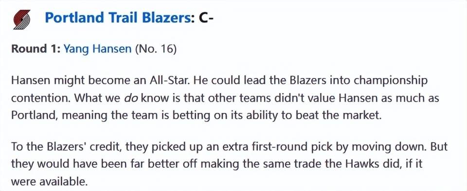 而NBA方面,美国媒体也不装了,全美第一大媒体ESPN专门派出了一个专栏作家介绍杨瀚森的情况,这个作家叫凯文-佩顿,他就发文表示:“杨瀚森在未来绝对有机会成为一位全明星球员,而且他有可能成为带领开拓者争夺总冠军的那个人。别的队伍可能不是很重视杨海森,但是开拓者对自己的眼光很有信心!”