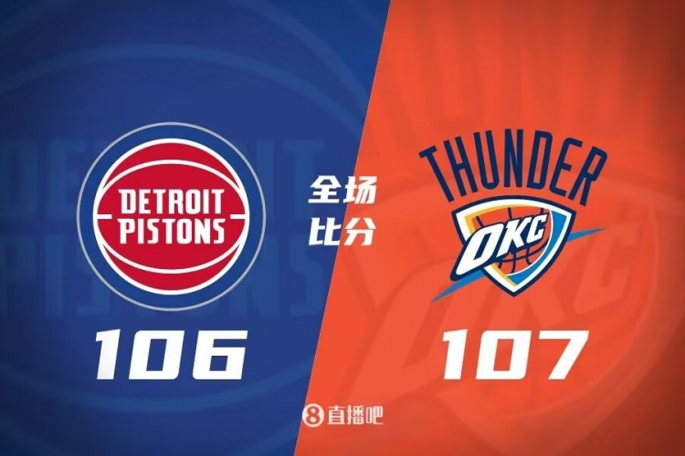 比赛开局,两队陷入拉锯战,缺少主将的雷霆投射手感不佳,依靠杀伤禁区取分,次节两队外线手感回暖,连续投进,双方依旧是交替取分,半场结束活塞56-54暂时领先。易边再战,雷霆稳扎稳打逐渐反超并占据场上主动,分差在五分上下浮动,比赛很快来到第四节。末节活塞重新蚕食分差并追平比分,两队再次陷入拉锯战,最后时刻雷霆连续取分重新占据领先,约瑟夫反超三分命中,但杰伦-威廉姆斯最后0.5秒完成补篮绝杀,雷霆107-106险胜活塞。