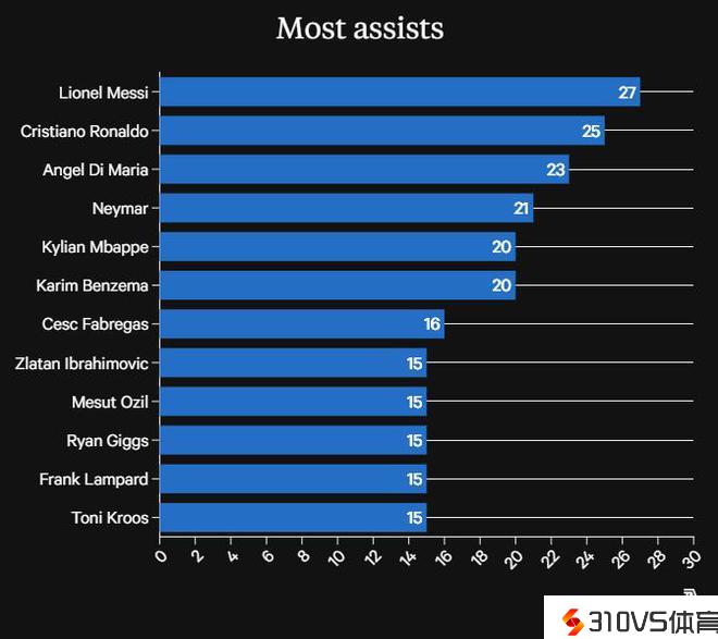 03-04赛季以来欧冠小组赛助攻排名:梅西27次居首,C罗次席