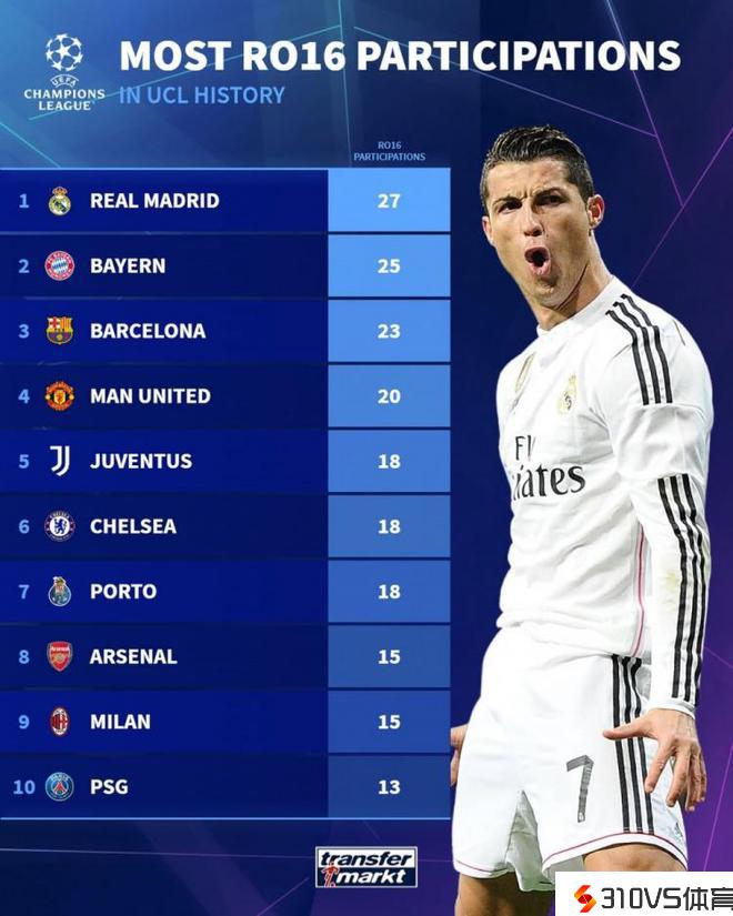 晋级欧冠16强次数排名:皇马27次居首,拜仁、巴萨二三位