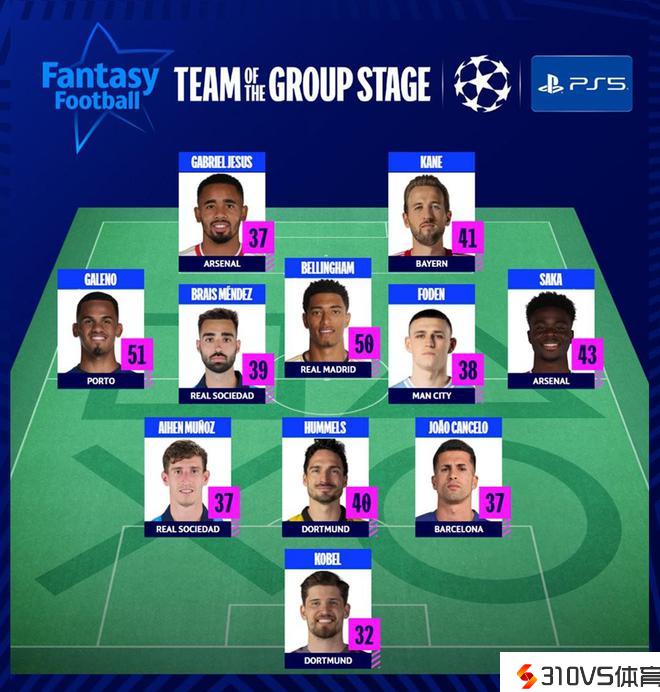 欧冠小组赛最佳阵容:凯恩热苏斯伙伴锋线,贝林、福登在列