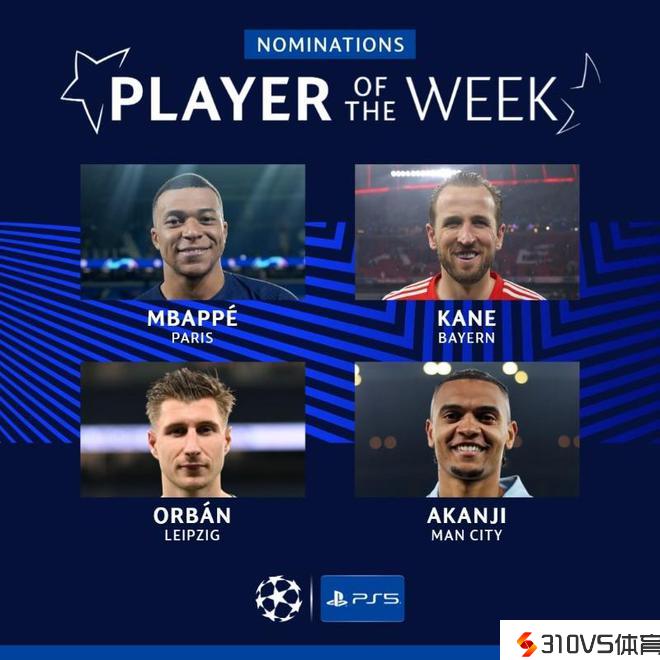 欧冠本周最佳球员候选:姆巴佩、凯恩、奥尔班、阿坎吉