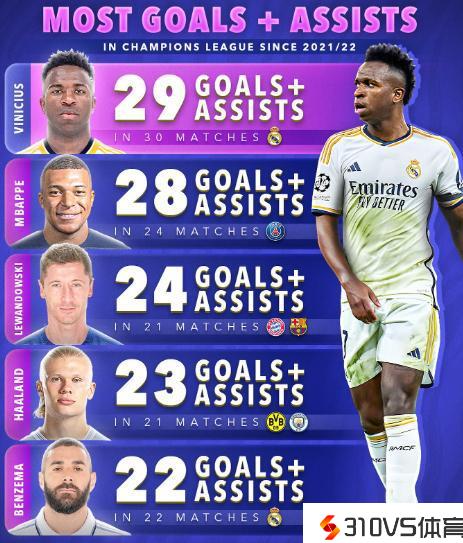 力压姆总魔人!维尼修斯是近3个赛季欧冠参与进球最多的球员