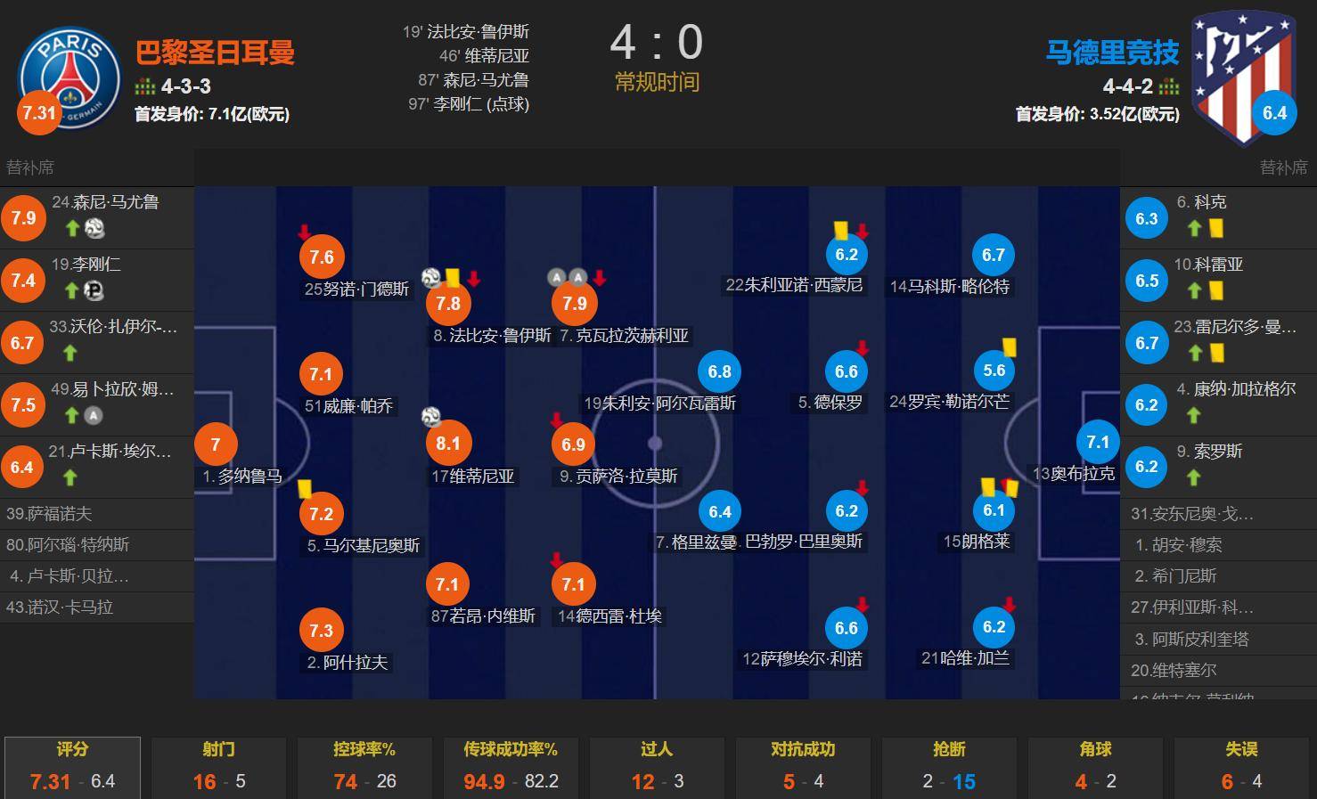 全场比赛,巴黎的控球率为74%,一共有16次射门,其中11次射正;马竞一共是5次射门,其中1次射正。身为好看足球的球迷,真想把阿尔瓦雷斯给巴黎,可以让巴黎的进攻更加高压逼抢以及进攻多元化,在马竞真的无法发挥小蜘蛛的进攻实力。