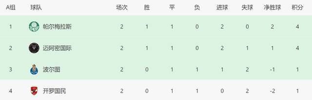 截至目前,在A组积分榜上,迈阿密国际和帕尔梅拉斯同积4分,因为净胜球少1个,迈阿密国际只能排名第二。由于领先身后的波尔图和开罗国民3分,最后一轮比赛,迈阿密国际对阵帕尔梅拉斯,只要保持不败,他们就肯定能够出线。