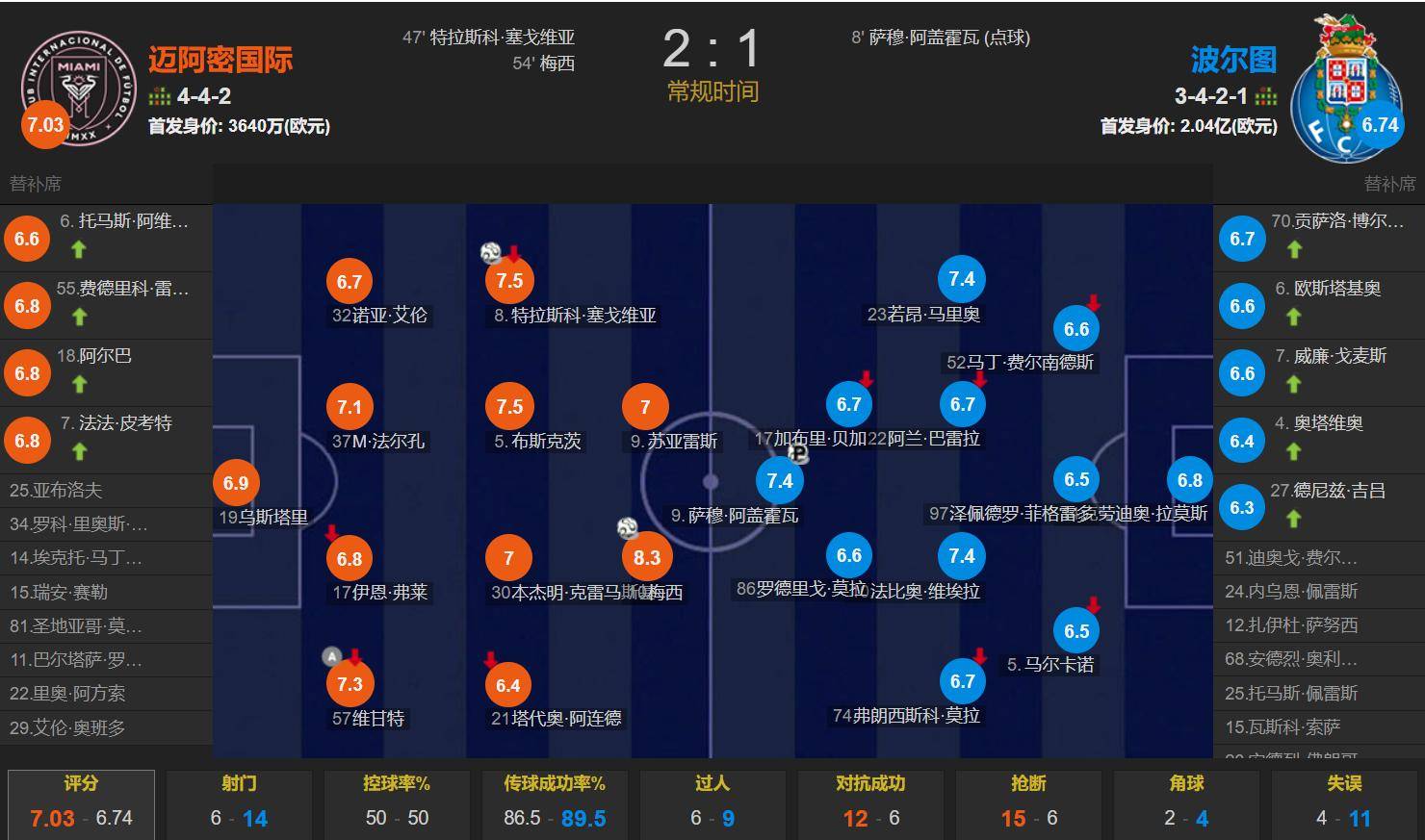 迈阿密国际2-1波尔图,双方首发身价对比3640万欧元vs2.04亿欧元。梅西再一次展示了球王体系,提升球队档次的实力,一脚无解任意球世界波,帮助迈阿密国际2-1击败葡萄牙豪门波尔图。赛后,梅西当选最佳球员。此役获胜,也是美职联球队首次在正式比赛中击败欧洲球队。梅西精妙传球,但苏亚雷斯错失单刀,苏牙真的老了,但梅西还能再战,若给梅西一个好的前锋,或许此役就是传射建功了,这就是球王的实力。