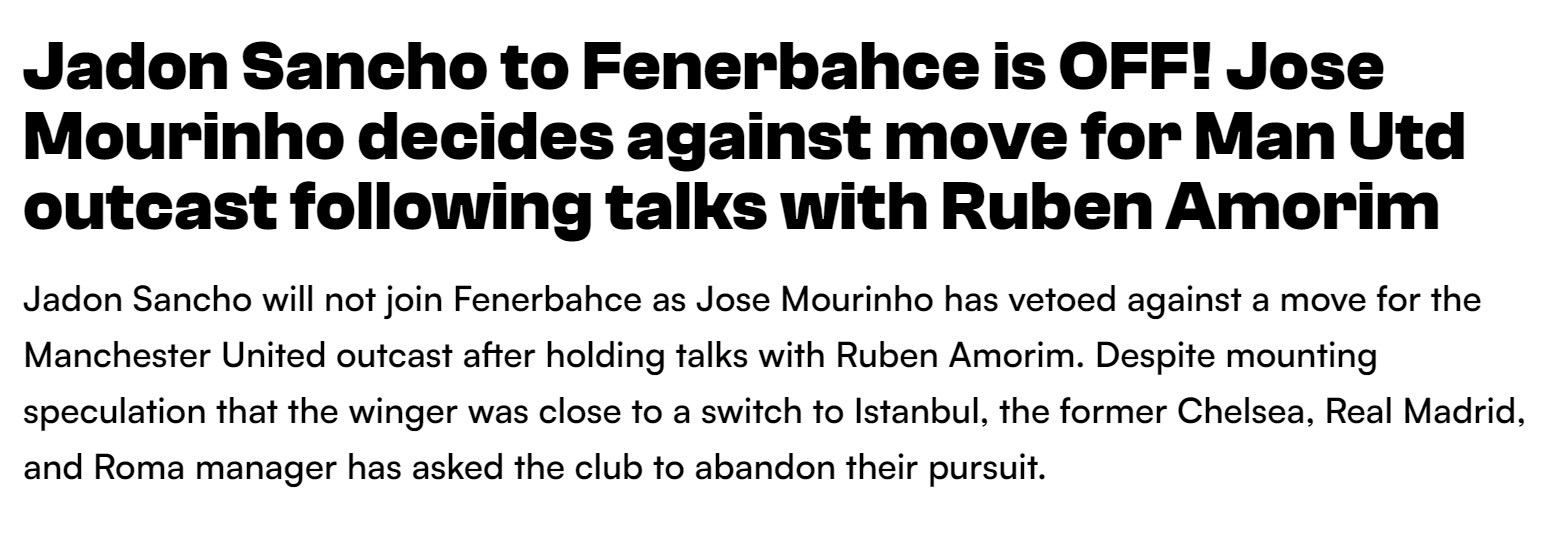 曼联卖了两年都滞销的桑乔,夏窗转会离队仍然不容易。虽然传闻很多,但他转会土超费内巴切的可能性已经排除,土媒披露,穆里尼奥与昔日学生鲁本·阿莫林交谈后,否决了引进这名25岁英格兰边锋的方案。