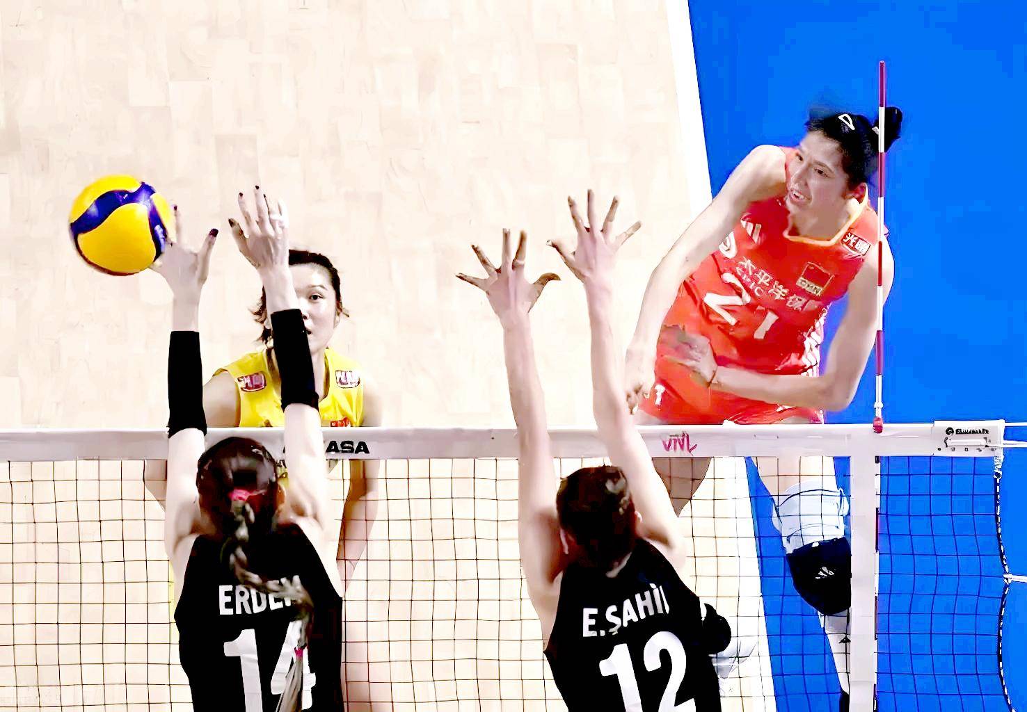 双方战成10:10平时,李盈莹扣球,土耳其队员防守时过网击球,主裁判却将这一分判给了土耳其队。