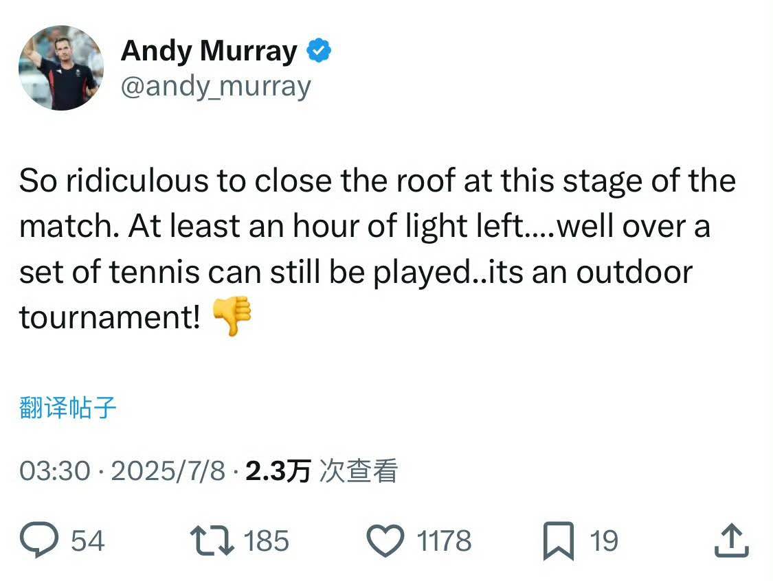 这一决定瞬间点燃舆论。英国名将穆雷在社交媒体炮轰组委会的这一决策:“荒唐!就非要这个时候关闭顶棚吗?至少还能支撑一小时,这明明是一项室外赛事!” 而球迷的质疑更为尖锐,“温网组委会的偏袒太自作多情了吧!这是在为辛纳续命吗?”