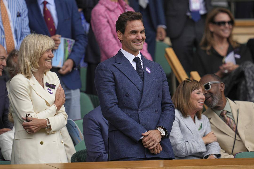瑞士网球传奇费德勒(中)坐在包厢内,见证着这位昔日对手的又一次突破。