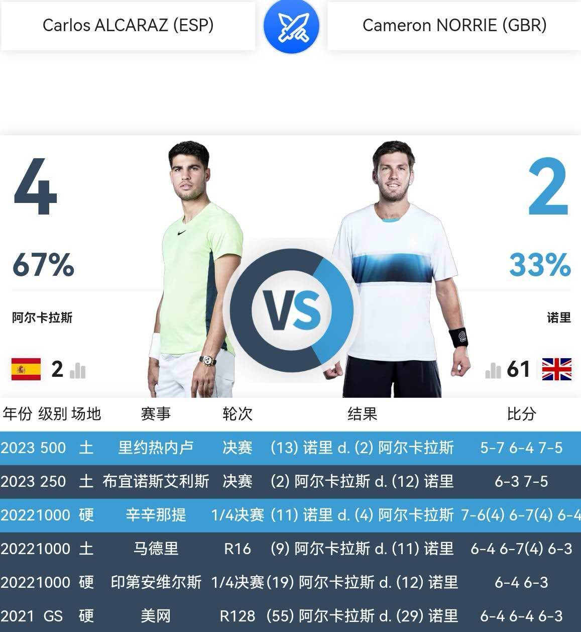 不曾想,在这场两人之间的第六次交锋之后,两位纳达尔迷弟再也没有交锋过了。因为一年半以来,诺里年事渐高,战绩堪忧、排名下滑,而阿尔卡拉斯披荆斩棘、高歌猛进,两人之间的差距,已经不可以道里计了。