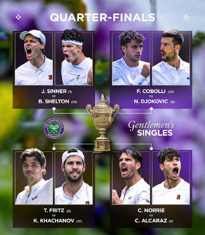 北京时间今晨,2025赛季温布尔登网球锦标赛结束了第八个比赛日的较量,男女单打八强全部产生。男子方面:头号种子、世界第一辛纳在3-6 5-7 2-2两盘落后的情况下,对手迪米特洛夫突遇伤病,胸痛难忍,无奈伤退,因此得以连续第四年跻身温网八强,将和美国新星谢尔顿争夺一个四强席位,后者四盘逆转了意大利人索内戈,首次在温网打进八强。