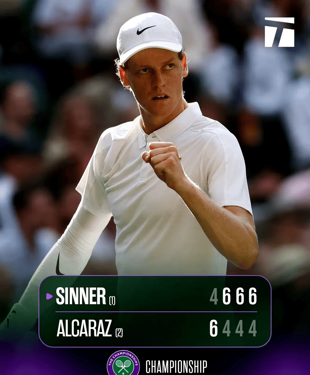特别是看到辛纳在首盘从4比2领先到最后以4比6输掉这一盘后,更让很多人坚信意大利人在温网根本不是阿尔卡拉斯的对手。坐等西班牙人卫冕成功,一举比肩网坛传奇博格,实现三巨头巅峰时也未能达成的这项壮举。