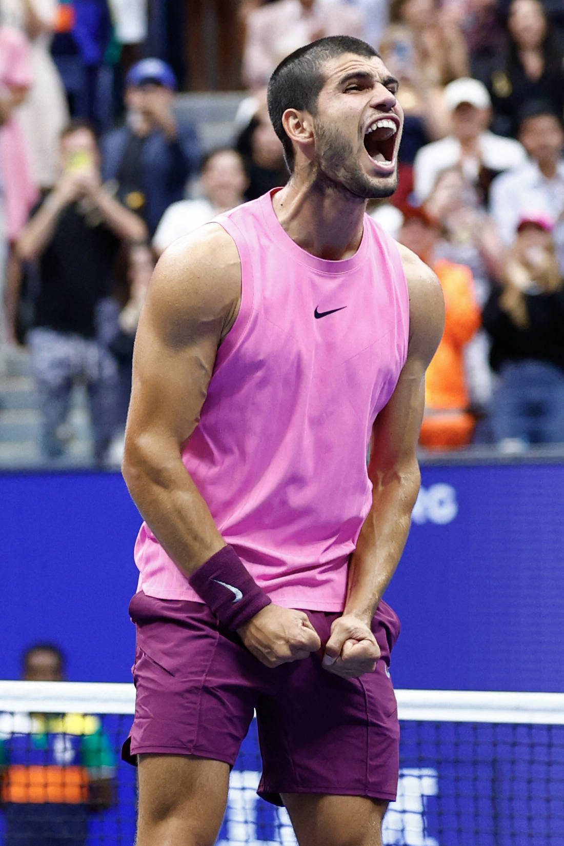 9月7日,阿尔卡拉斯庆祝比赛胜利。 新华社/法新