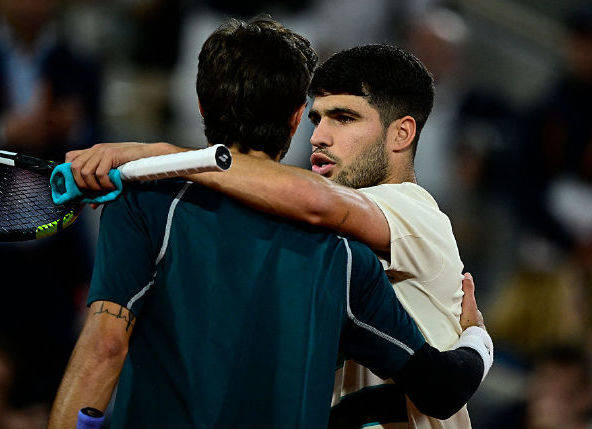 在首场半决赛中,阿尔卡拉斯在4-6 7-6(3) 6-0 2-0领先的情况下,收到意大利名将穆塞蒂的退赛礼,连续两年跻身法网决赛,距离卫冕只差一场胜利。穆塞蒂在前两盘的表现堪称顶级,只是拼得太凶,导致左大腿拉伤,最终无奈退赛,可惜了!阿尔卡拉斯在赛后也表示,“以这样的方式获胜并不是我想要的,洛伦佐度过了一个成功的红土赛季。我祝他一切顺利,希望他早日康复,能让我们早日再次欣赏他的球技。”