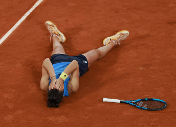 最后来猜一猜认一认。下面这张图片是一位球员赢球之后倒地庆祝。不作提示,您能认出她是谁吗?