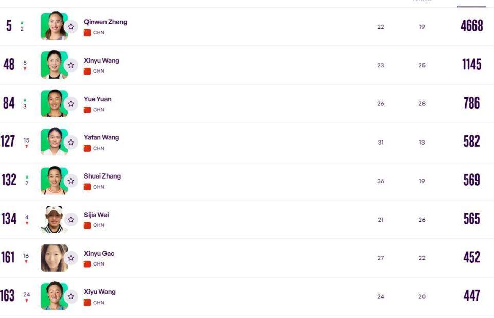 中国选手方面,除了前边提到的郑钦文之外,前100还有2位金花。王欣瑜从第43位下滑到了第48位,袁悦上升3个位次来到世界第84。王雅繁下降15位排名127,张帅提升2位来到132,韦思佳、高馨妤均有不同幅度下滑,王曦雨从139位下降到了第163位。