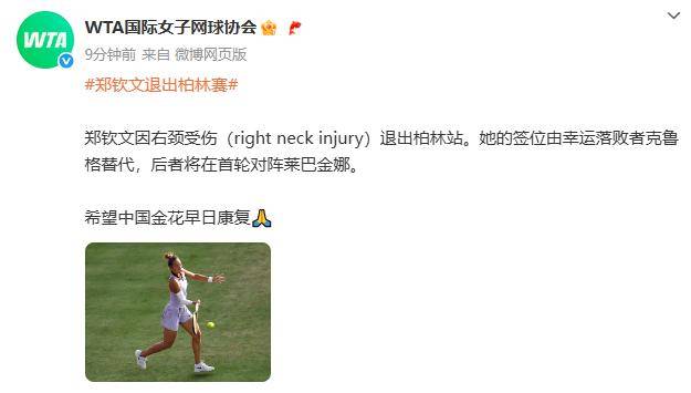 “郑钦文因右颈受伤(right neck injury)退出柏林站。”中国一姐宣布对外退赛后,WTA官网也在第一时间发布了这则消息,给出的原因是右颈伤病。