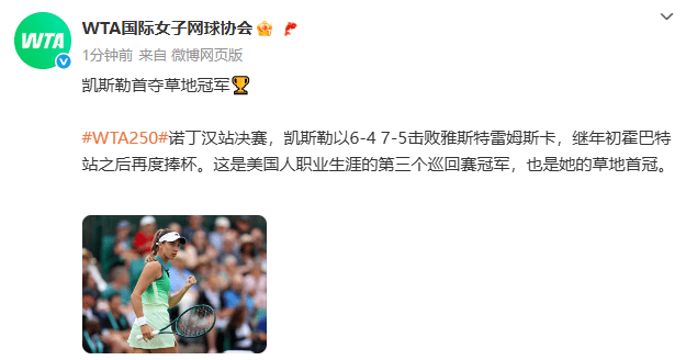 #WTA250#诺丁汉站决赛,凯斯勒以6-4 7-5击败雅斯特雷姆斯卡,继年初霍巴特站之后再度捧杯。这是美国人职业生涯的第三个巡回赛冠军,也是她的草地首冠。