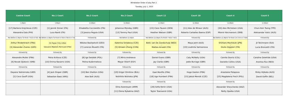 7月1日,温网将会进入第2比赛日的角逐。男单上半区和女单下半区首轮比赛开打,此外首个比赛日未完成的几场对决,也被推迟到了第2比赛日进行。德约科维奇、辛纳、高芙、佩古拉、斯瓦泰克、郑钦文、王欣瑜等,都会迎来今年温网首秀。