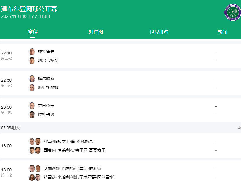 北京时间7月4日消息,2025年温网继续进行。女子单打第三轮,世界第一萨巴伦卡迎战前美网冠军拉杜卡努。前两轮,萨巴伦卡状态神勇,她以2个2-0的比分强势晋级,在二到五号种子都已经出局的情况下,萨巴伦卡夺冠优势越来越明显。