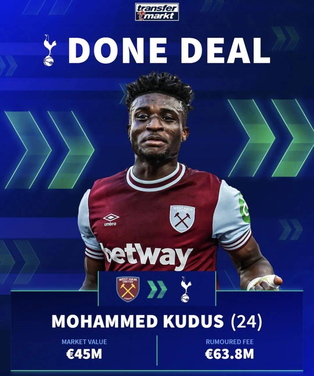 据此前《The Athletic》名记大卫-奥恩斯坦以及罗马诺的报道,热刺为签下库杜斯将会向西汉姆联支付5500万英镑的转会费。