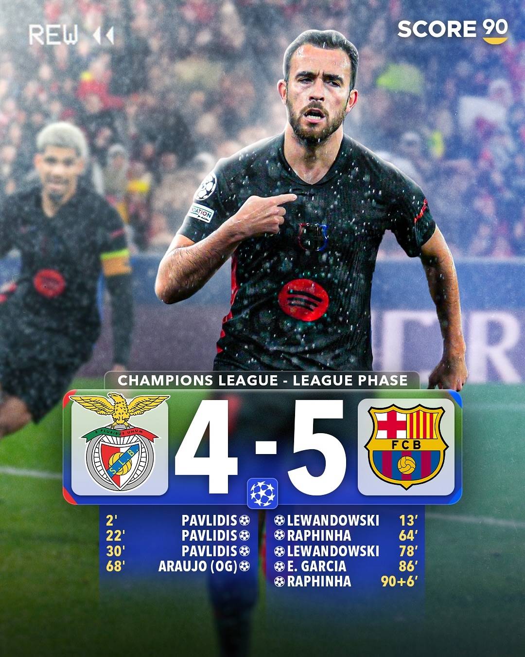候选三:欧冠联赛阶段,本菲卡4-5巴萨,进攻大战,你进4,我进5,9球大战。