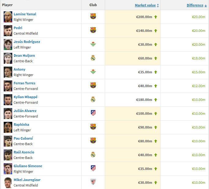 北京时间6月9日,德国转会市场公布了西甲球员的最新身价,其中亚马尔、佩德里、赫苏斯-罗德里格斯身价上涨2000万欧元,位列西甲球员身价涨幅榜第一。