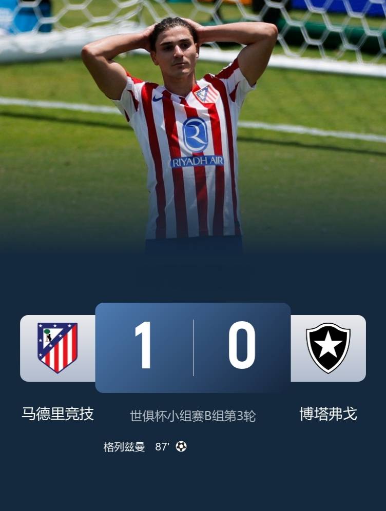 同时进行的马竞vs博塔弗戈的比赛,战况非常胶着,南美解放者杯冠军博塔弗戈稳守反击,马竞久攻不下。直到比赛第87分钟才打破场上僵局,阿尔瓦雷斯左路倒三角回做,替补出场的格列兹曼后点迎球推射打入绝杀进球。最终,马竞1-0击败了博塔弗戈。但马竞全场狂射27脚,才打入1球,西蒙尼的最大短板就是进攻。