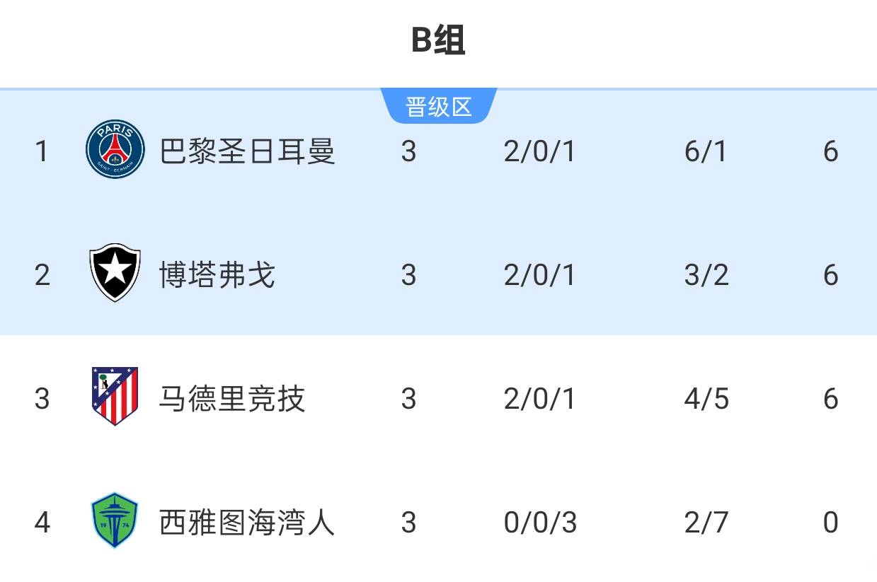 世俱杯B组3轮全部战罢,巴黎、博塔弗戈、马竞都是2胜1负积6分,同分先看相互战绩,由于相互战绩是一个小循环,因此三队需要比较净胜球,巴黎5个,博塔弗戈1个,马竞-1个,因此巴黎和博塔弗戈携手晋级,其中巴黎是B组头名,马竞遗憾出局,球员和教练可以度假蓄能新赛季了。