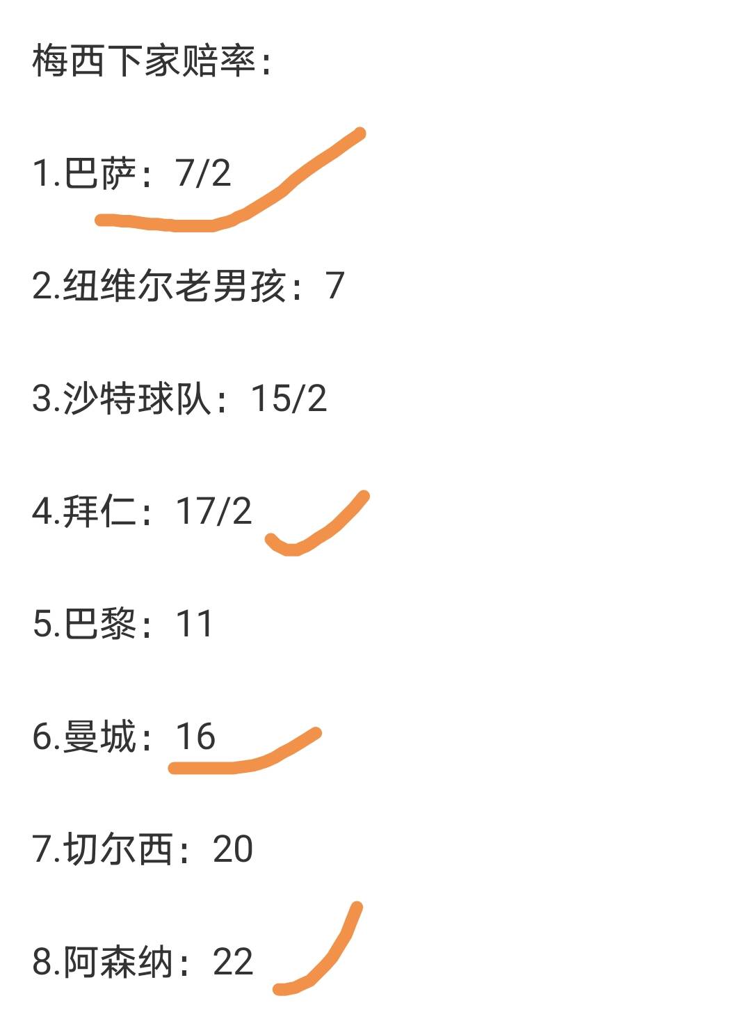 当然梅西并没有透露自己具体想去哪里踢球,不过有相关的机构很快给梅西的去向开出了赔率,我们来看看。