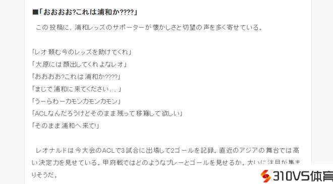 除浦和红钻外,莱昂纳多还曾在新泻天鹅、鸟取飞翔等球队效能过,深受球迷喜欢。日本球迷留言表示:“莱奥,留上去吧!”“请来协助红队吧(浦和红钻)!”“莱奥可以转会吗?”“说真的,可以加盟浦和红钻吗?”。