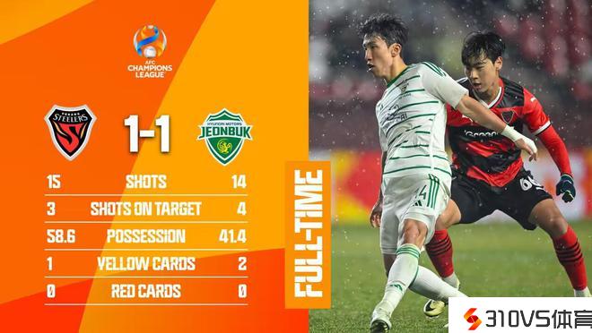 全北现代客场1-1浦项制铁,总比分3-1晋级亚冠8强
