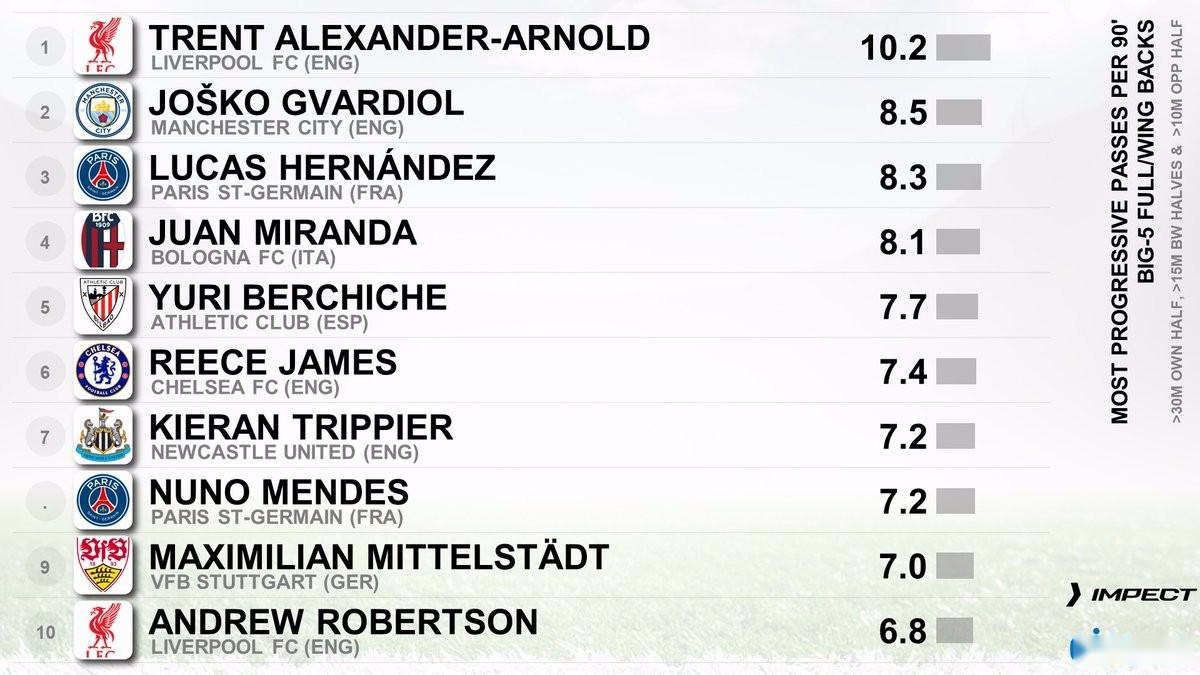本赛季五大联赛后卫场均向前传球前十